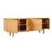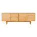 Solid Oak Buffet with a mid-century modern style. This buffet has four doors that open to reveal storage space all upheld on slender legs.Assembly required: