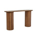 Textured pillar supports steal the show on the Orion Pillar Console. Composed of beautiful teak this gorgeous console is finished with a simple demi bullnose top.Assembly required: