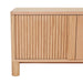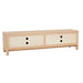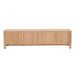 The Orion entertainment unit has minimalist lines that are enlivened by textural and material contrasts. Raised on pillar legs it has four doors that open to reveal abundant storage.Assembly required: